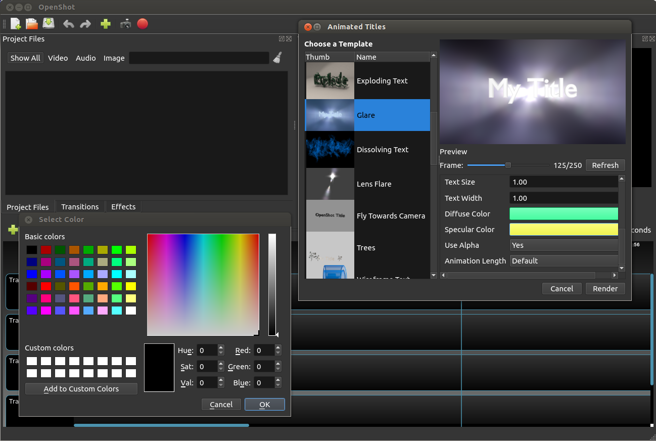 Here is our completed template-based 3D animation system, which is one of the more complex features in OpenShot. It uses Blender (a popular 3D animation application) as the back-bone, and allows you (the user) to easily adjust an animation, customize text and colors, and generate a 3D animation to use in your video.