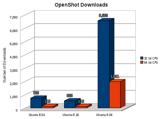 I wanted to share a chart of our download stats with everyone. I thought you might find it interesting how our downloads break-down between the various versions of Ubuntu, and between 32 & 64 bit CPU architectures. As you can see, Ubuntu 9.04 is easily the most popular target for OpenShot.